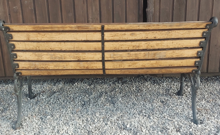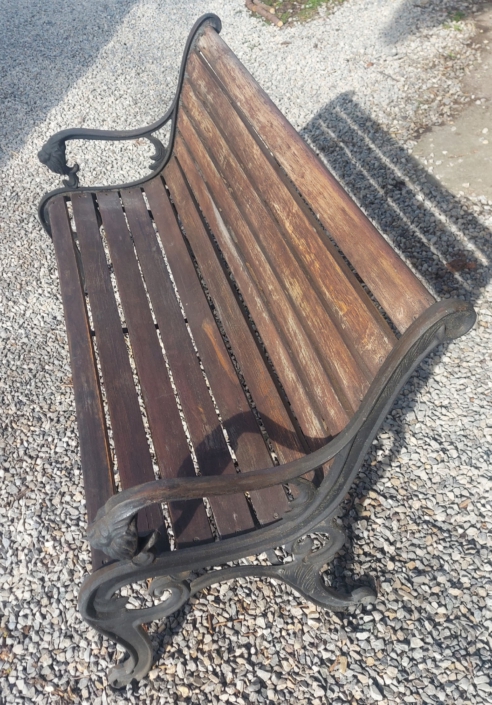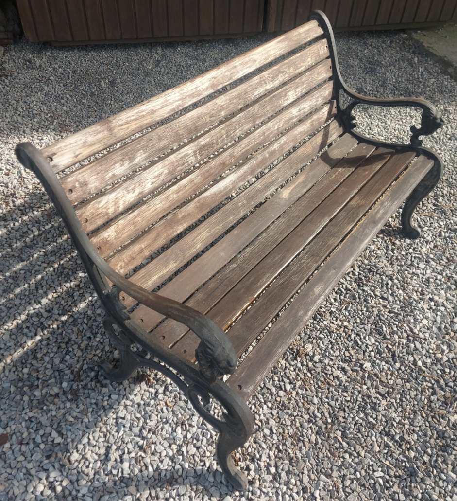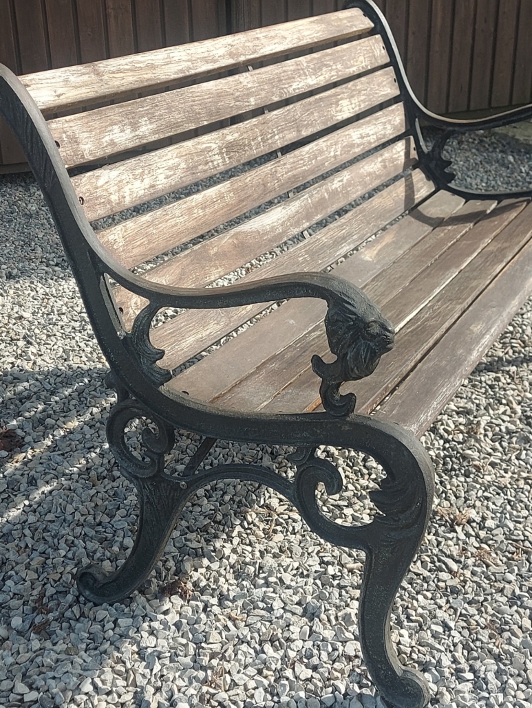 - Beschreibung: Gartenbank mit Gusseisenrahmen mit Löwenkopfarmlehnen und Massivholzlatten